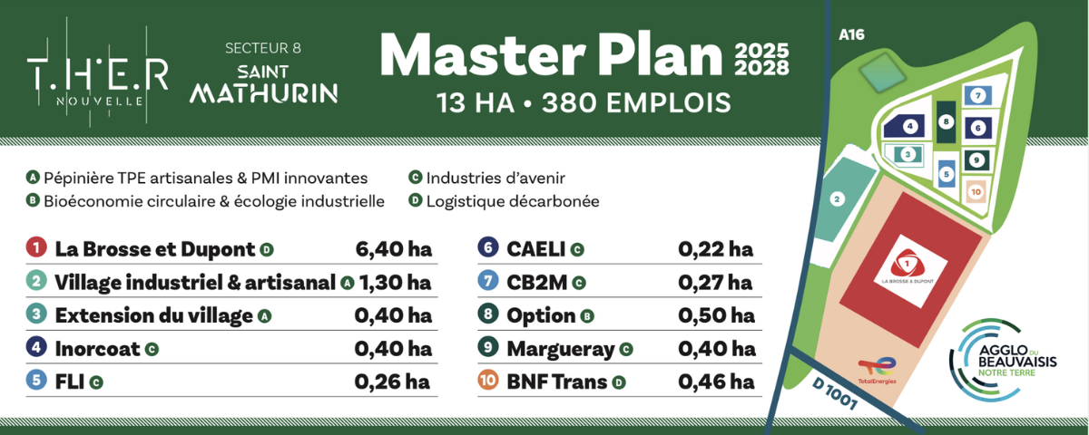 Pensée dès 2011 par l’Agglomération du Beauvaisis, cette nouvelle zone d’activités, située au sud de Beauvais, en lien direct avec l’A16, incarne l’ambition du territoire d’accueillir de jeunes industries d’avenir, de développer une logistique décarbonée et de soutenir les activités artisanales.
