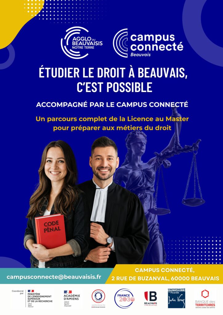 Cette nouvelle opportunité permettra aux étudiants de préparer une Licence ou un Master en droit à distance à Beauvais, tout en bénéficiant d’un accompagnement et d’un suivi personnalisé dans un environnement adapté, moderne et encadré.